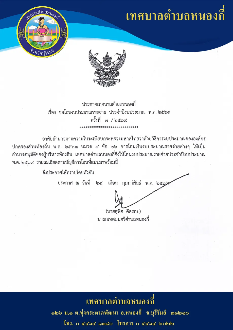 ประกาศ เรื่อง ขอโอนงบประมาณรายจ่าย ประจำปีงบประมาณ พ.ศ.2569 ครั้งที่ 7/2569